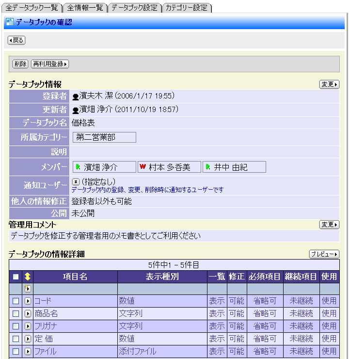 データブックオプションを搭載したテレタイムZaionでは、ユーザーレベルでデータベースを自由に設計し社員間で共有することができます。